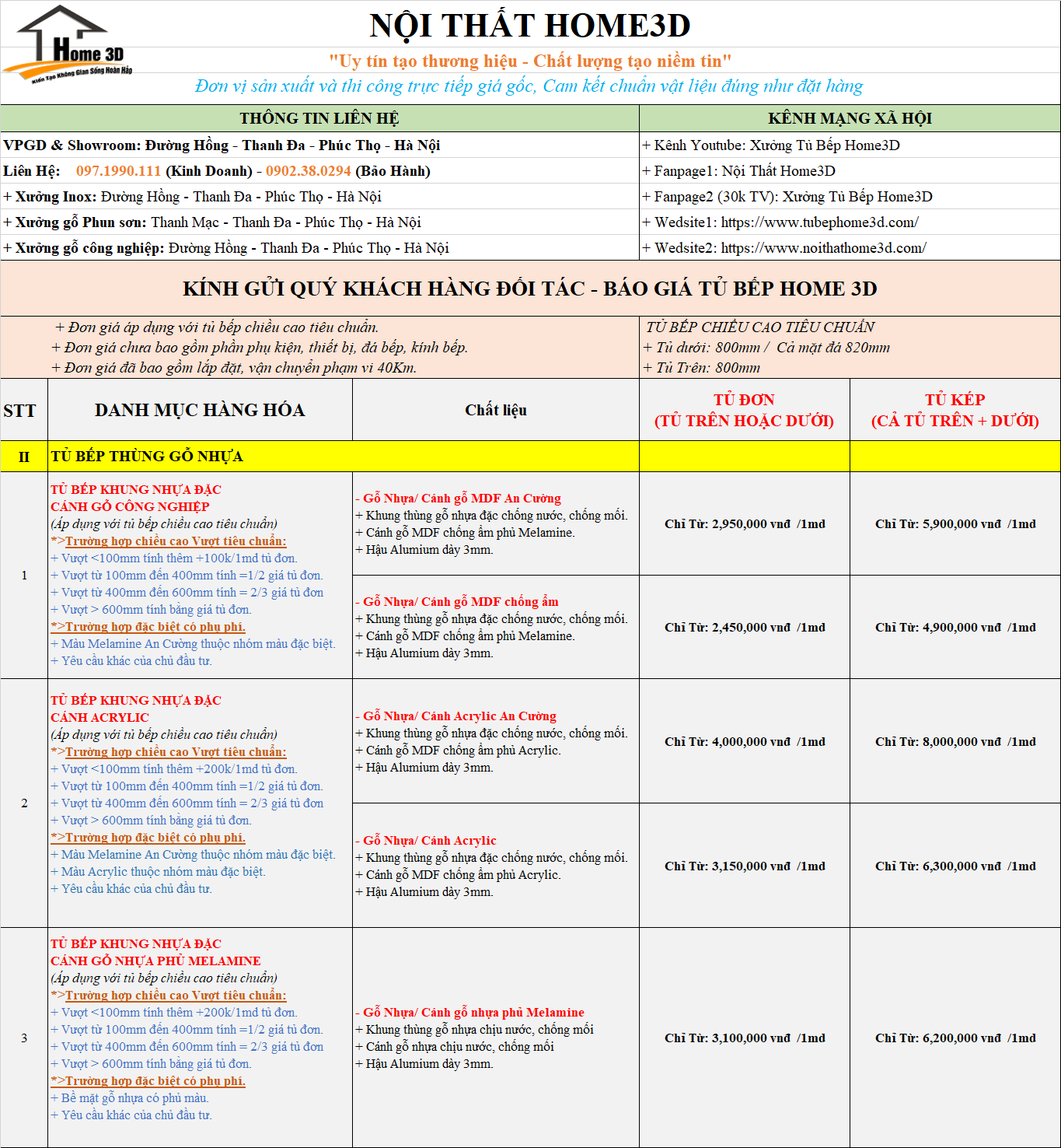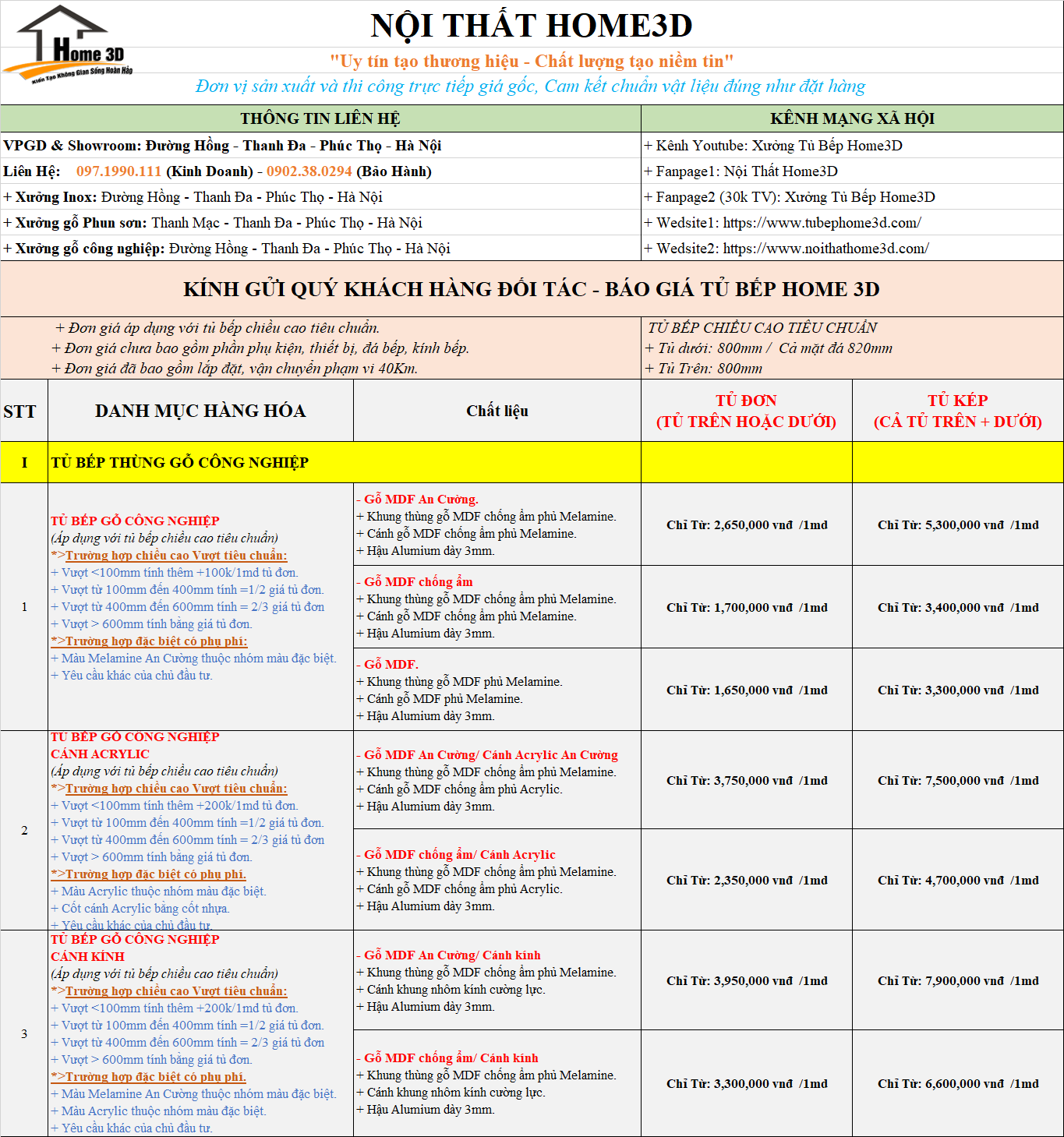 Xưởng Sản Xuất Nội Thất Home 3D Gửi Tới Quý Khách Hàng Báo Giá Tủ Bếp Mới Nhất , Phụ Kiện Cách Tính Chi Phí Các Loại Tủ Bếp Đơn Giản Nhất .