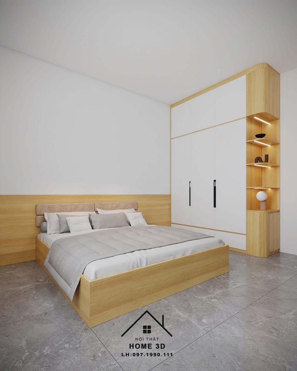 Phòng ngủ tại dự án Anh Chuyên được thiết kế “phản quang nhẹ” – tường sơn sáng kết hợp đầu giường gỗ laminate, ánh sáng dịu – để tạo cảm giác thư giãn. Tủ âm tường tận dụng góc trống. Bậc đèn chân giường, đèn đọc sách được bố trí hợp lý.